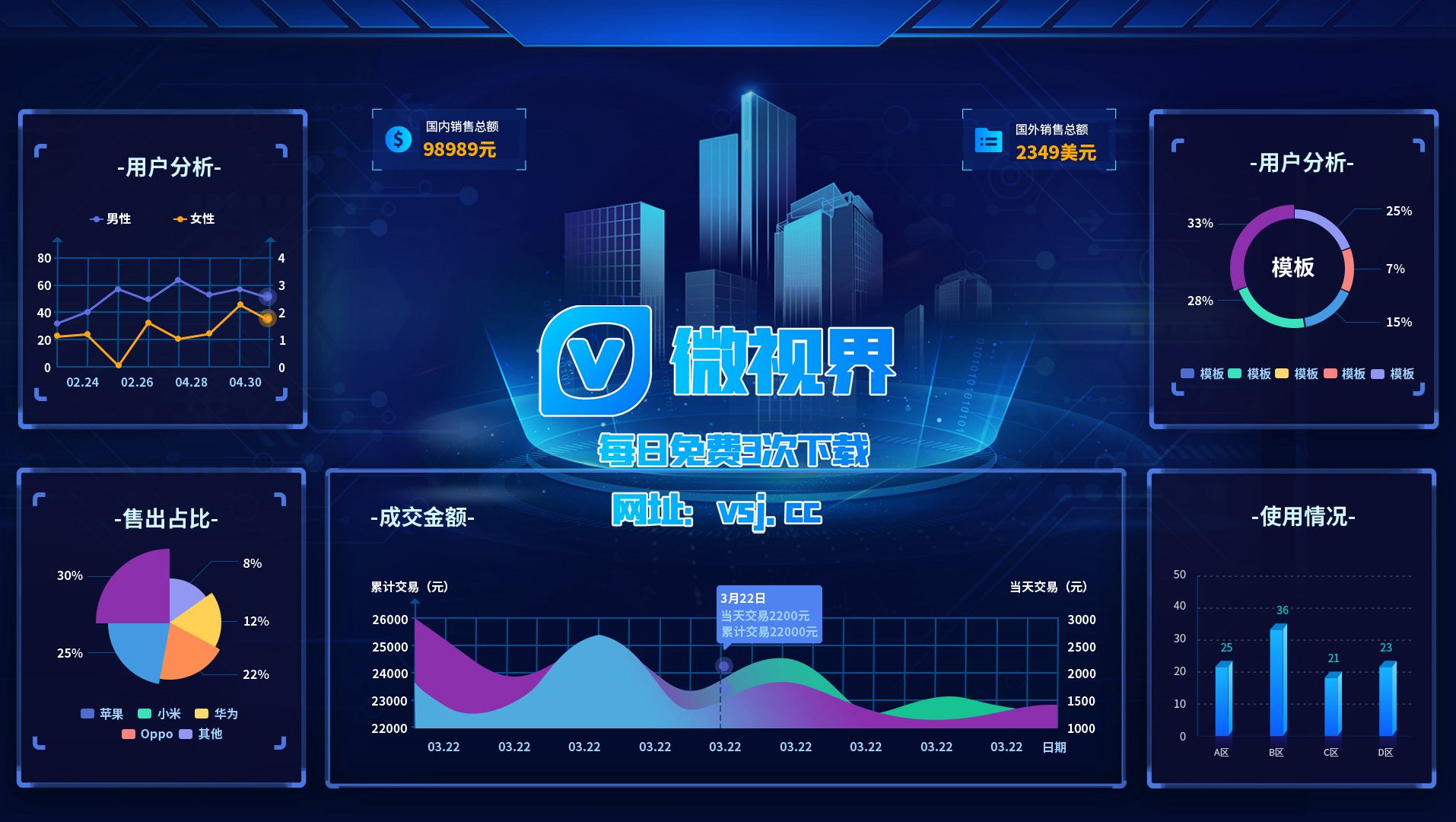 1238_【大屏UI】销售额数据化_PSD素材下载更多免费内容请访问微世界VSJ.cc 声明:本站所有文章,如无特殊说明或标注,均为网络收集。任何个人或组织,在未征得原作者同意时,禁止商用。如若本站内容侵犯了原著者的合法权益,可联系我们进行处理。