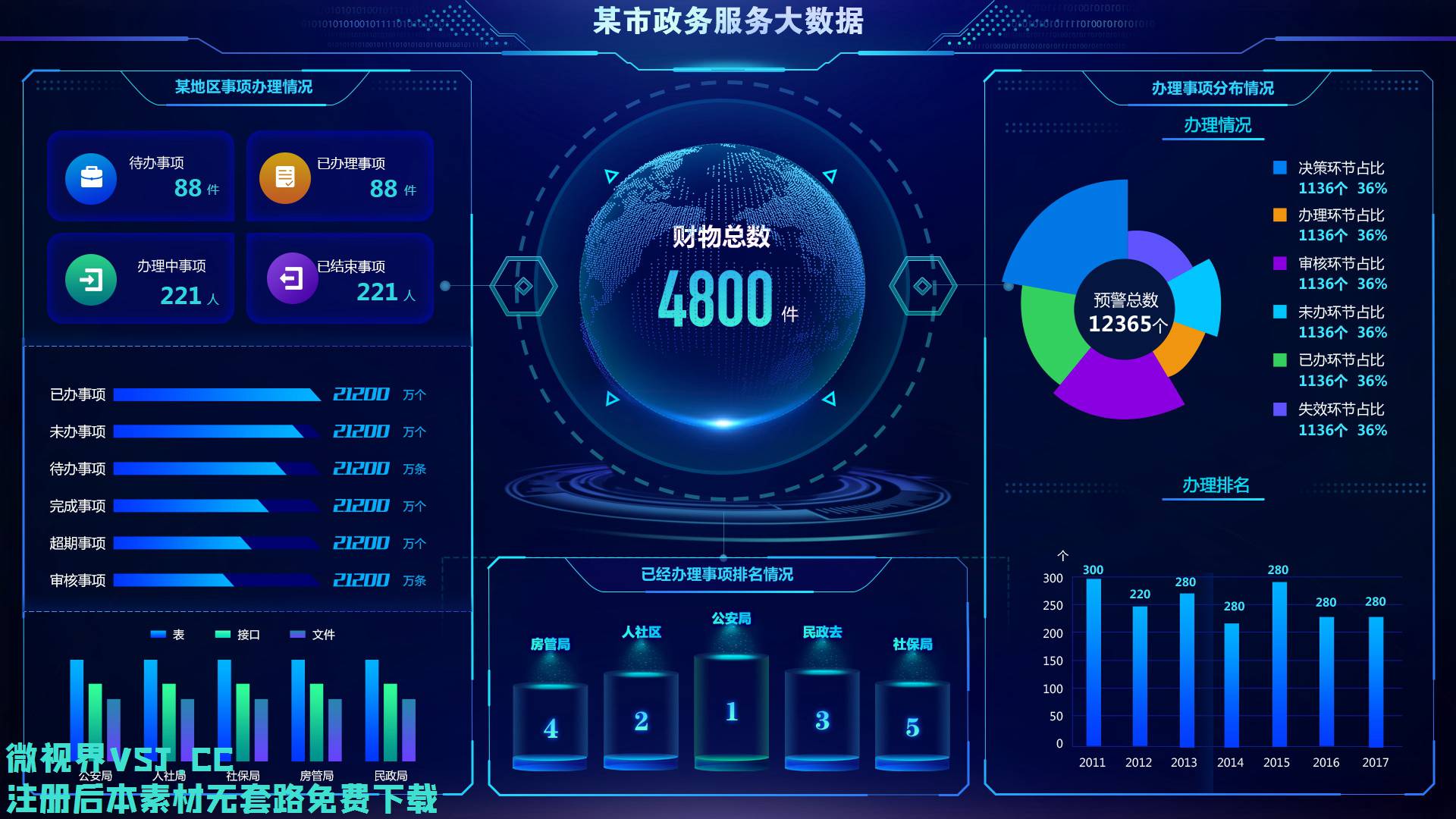 【大屏UI】0933_深蓝色政务服务大数据可视化界面_PSD素材下载更多免费内容请访问微世界VSJ.cc 声明:本站所有文章,如无特殊说明或标注,均为网络收集。任何个人或组织,在未征得原作者同意时,禁止商用。如若本站内容侵犯了原著者的合法权益,可联系我们进行处理。